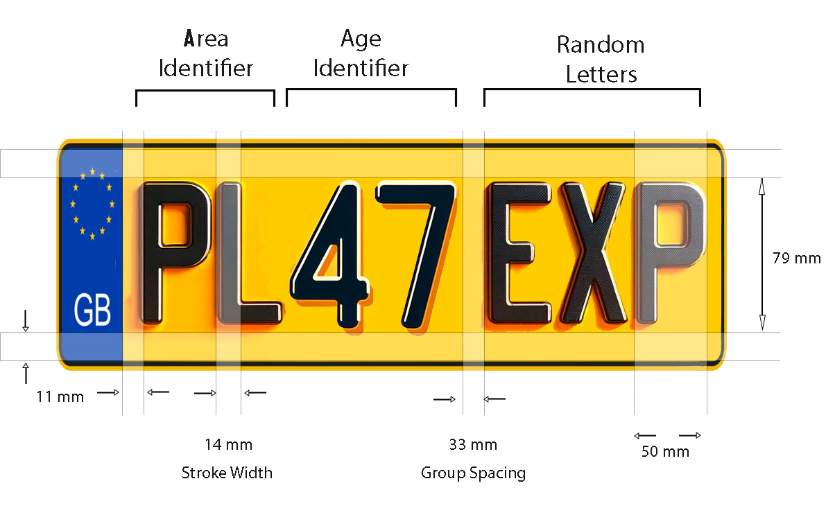 Beyond the font itself, the size and spacing of characters on your number plate are also subject to strict regulations. Each letter and number must measure precisely 79mm in height and 50mm in width. This ensures they are large enough to be easily read from a safe distance, even in less than ideal lighting conditions. The space between individual characters is equally important, with a mandated 11mm gap separating them. This prevents visual crowding and ensures each character remains distinct. Additionally, a specific 33mm gap is required between the age identifier (the two-letter code indicating when the vehicle was first registered) and the random number elements on the plate. Maintaining these precise measurements is crucial for ensuring your number plate is easily identifiable by both human eyes and automated systems.